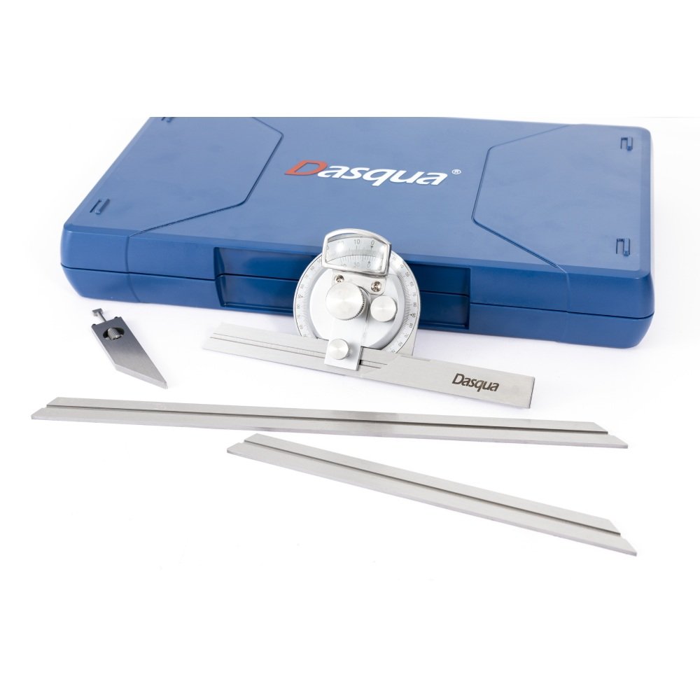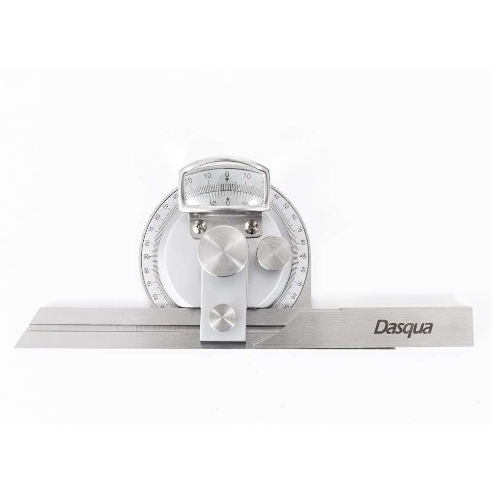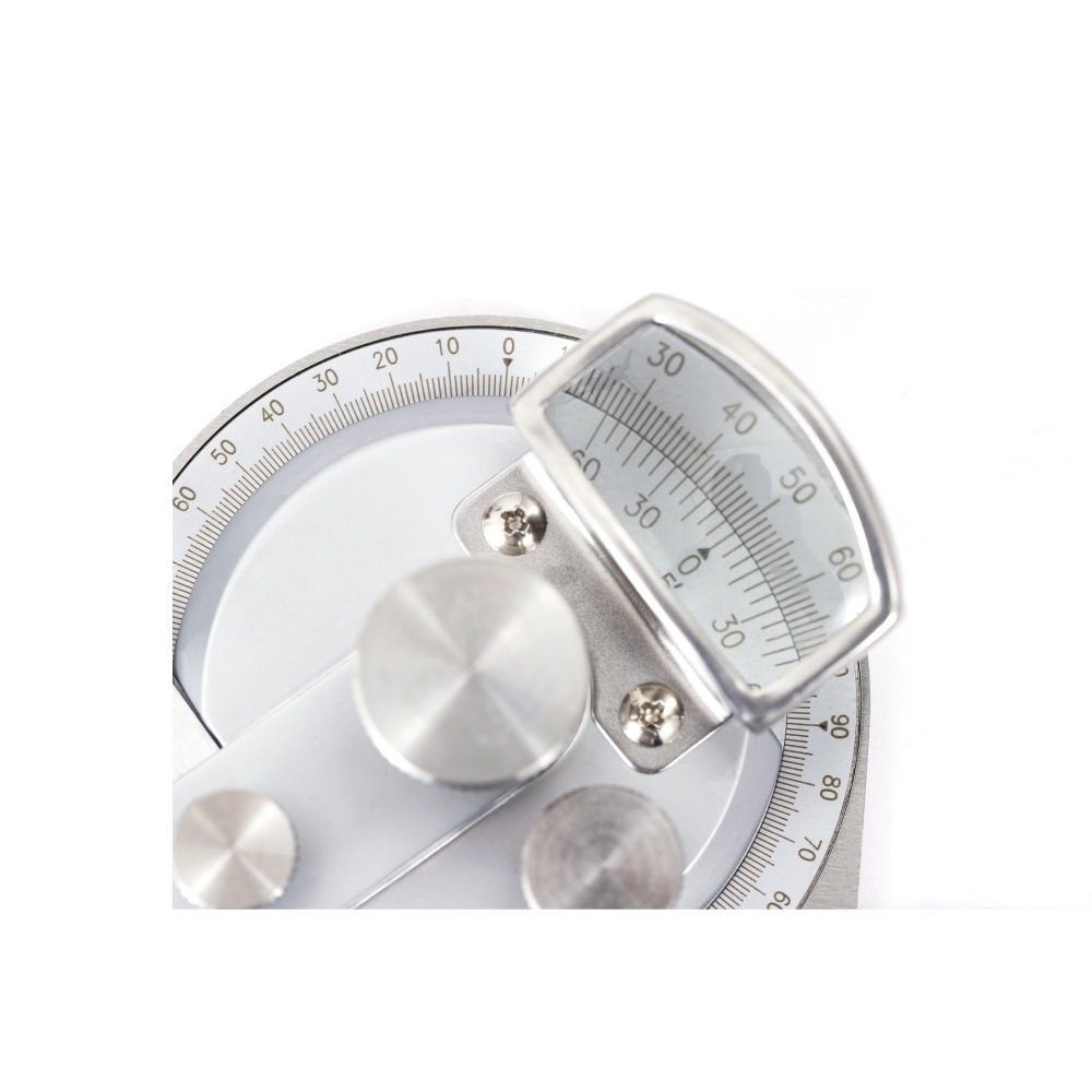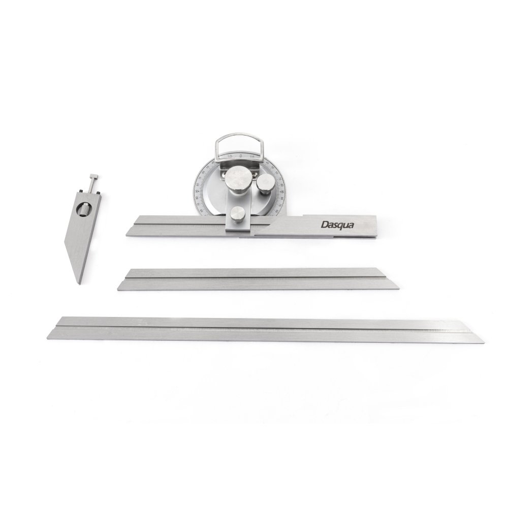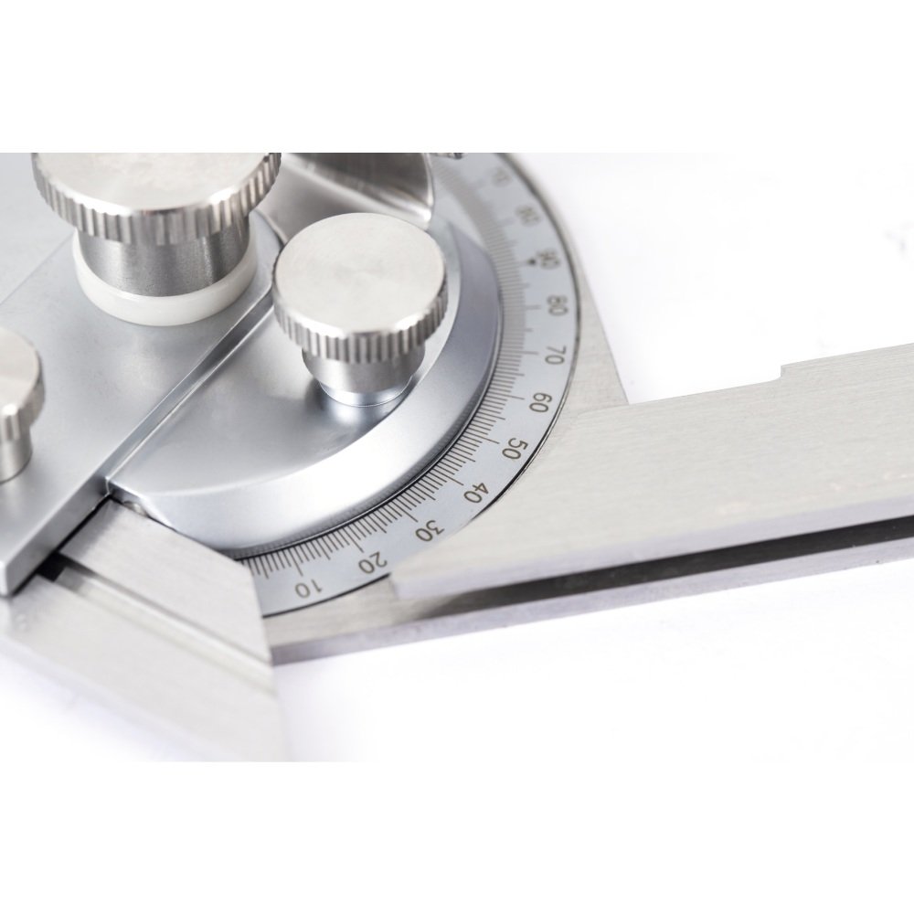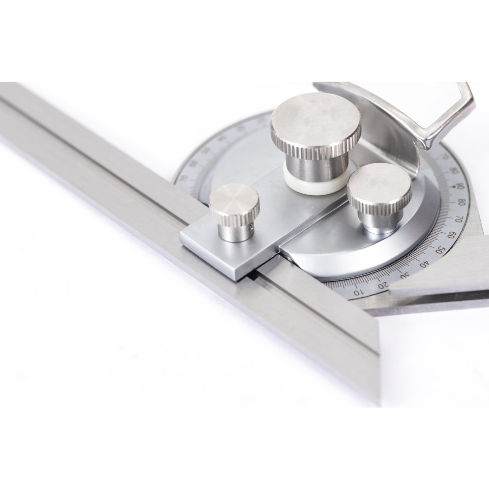 hecho de acero inoxidable -GRADUACION: 4X90° -Con una lupa para una lectura fácil y clara. -La superficie de medición templada, rectificada y lapeada garantiza un movimiento suave Acabado cromado satinado, antioxidante y duradero. -Con ajuste fino -Provisto de tres cuchillas (150 mm, 200 mm, 300 mm)