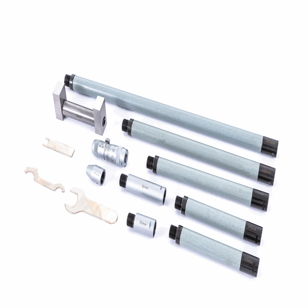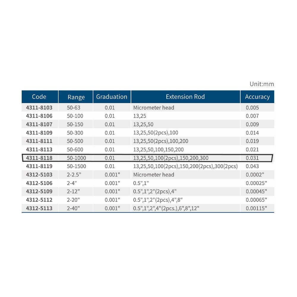 •Amplia gama de medición: Permite mediciones de diversos rangos combinando varillas de extensión y yunques con el cabezal micrométrico.