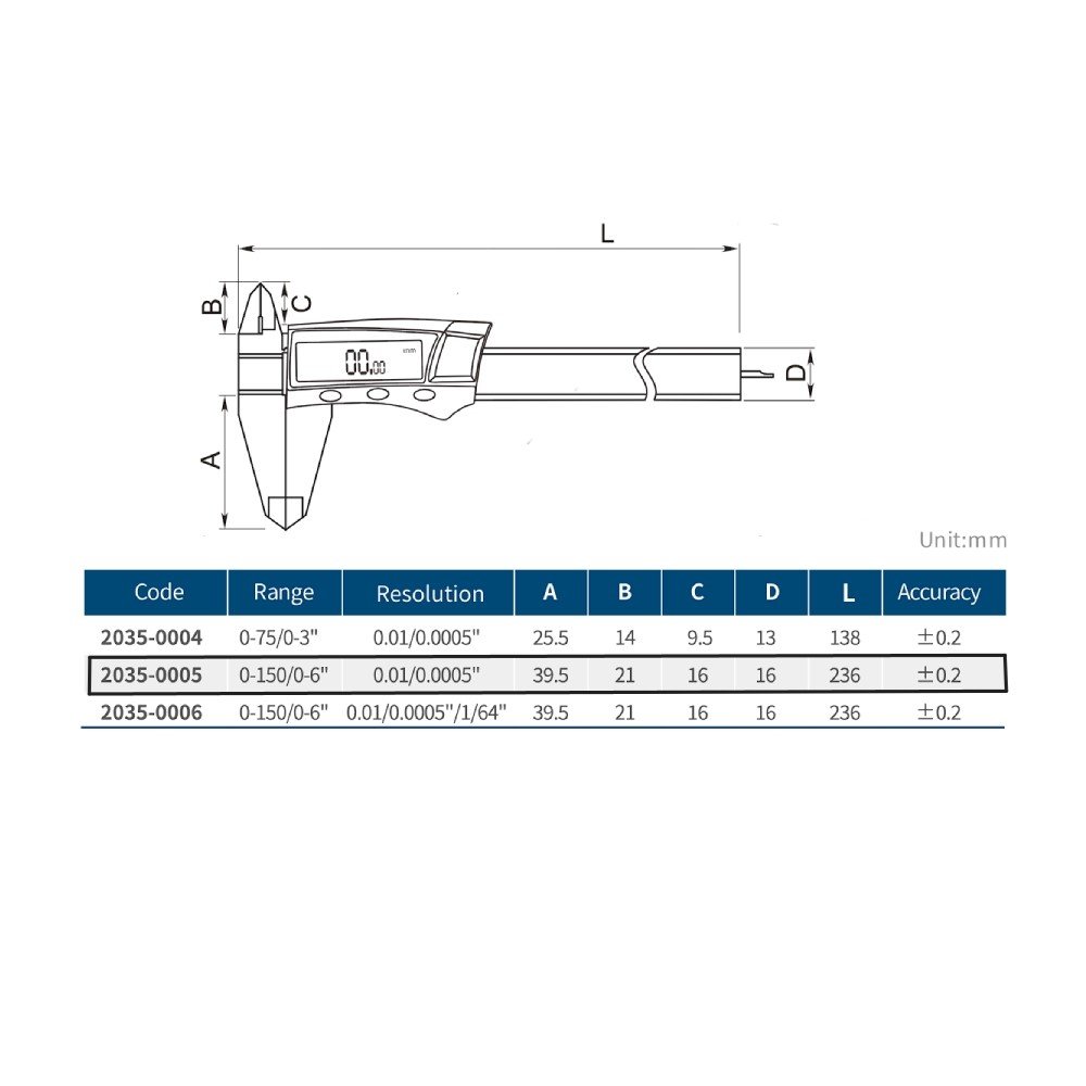 -Rango: 0-150mm -Resolución: 0.01/0.0005“ -Precisión: ±0.2